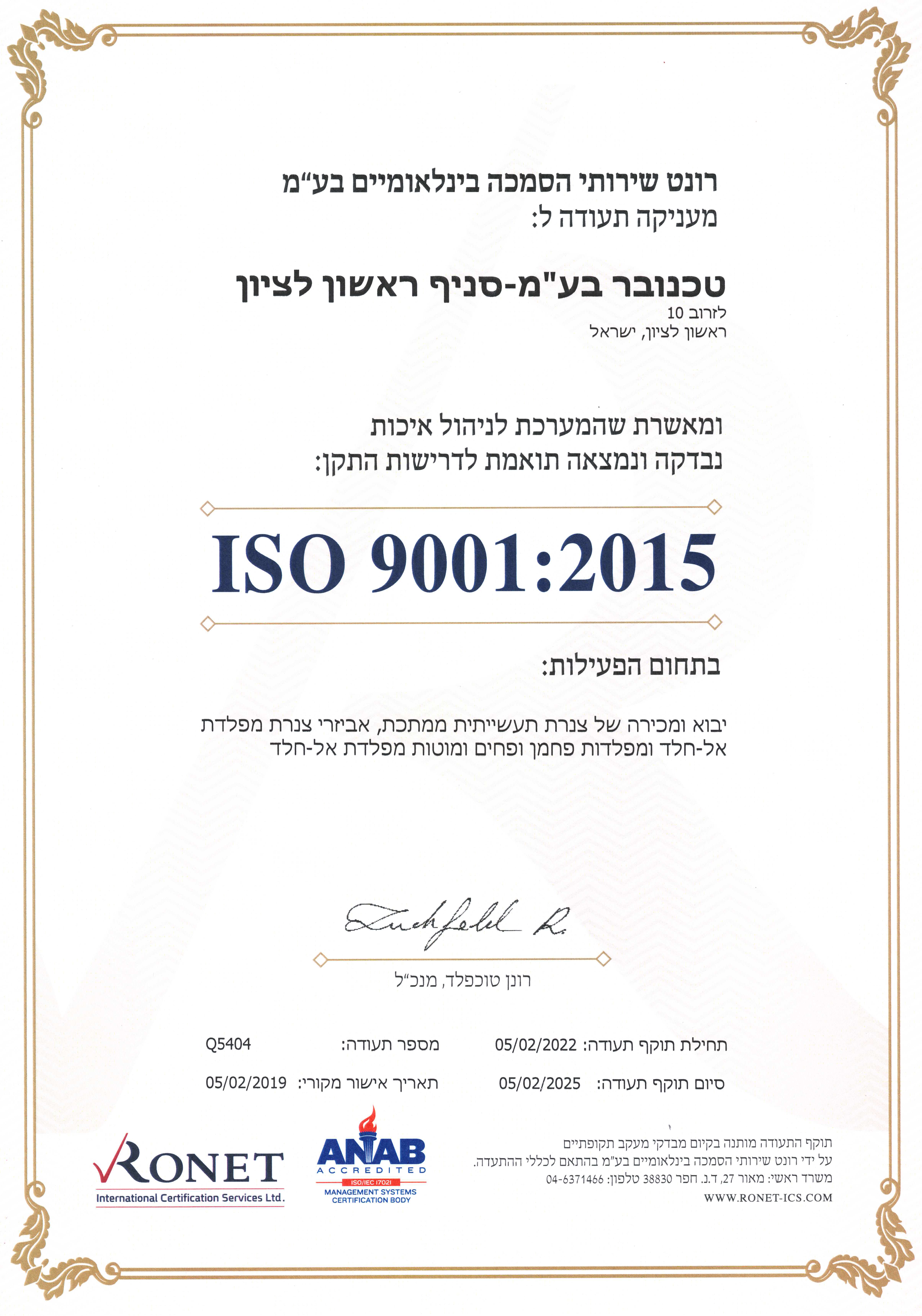 מדיניות האיכות בארגון מחויבת לספק מוצרים ברמת איכות ושירות המתאימים או עולים על דרישות הלקוח. החברה מספקת מוצרים העומדים ומיוצרים על פי דרישות התקנים הבינלאומיים.